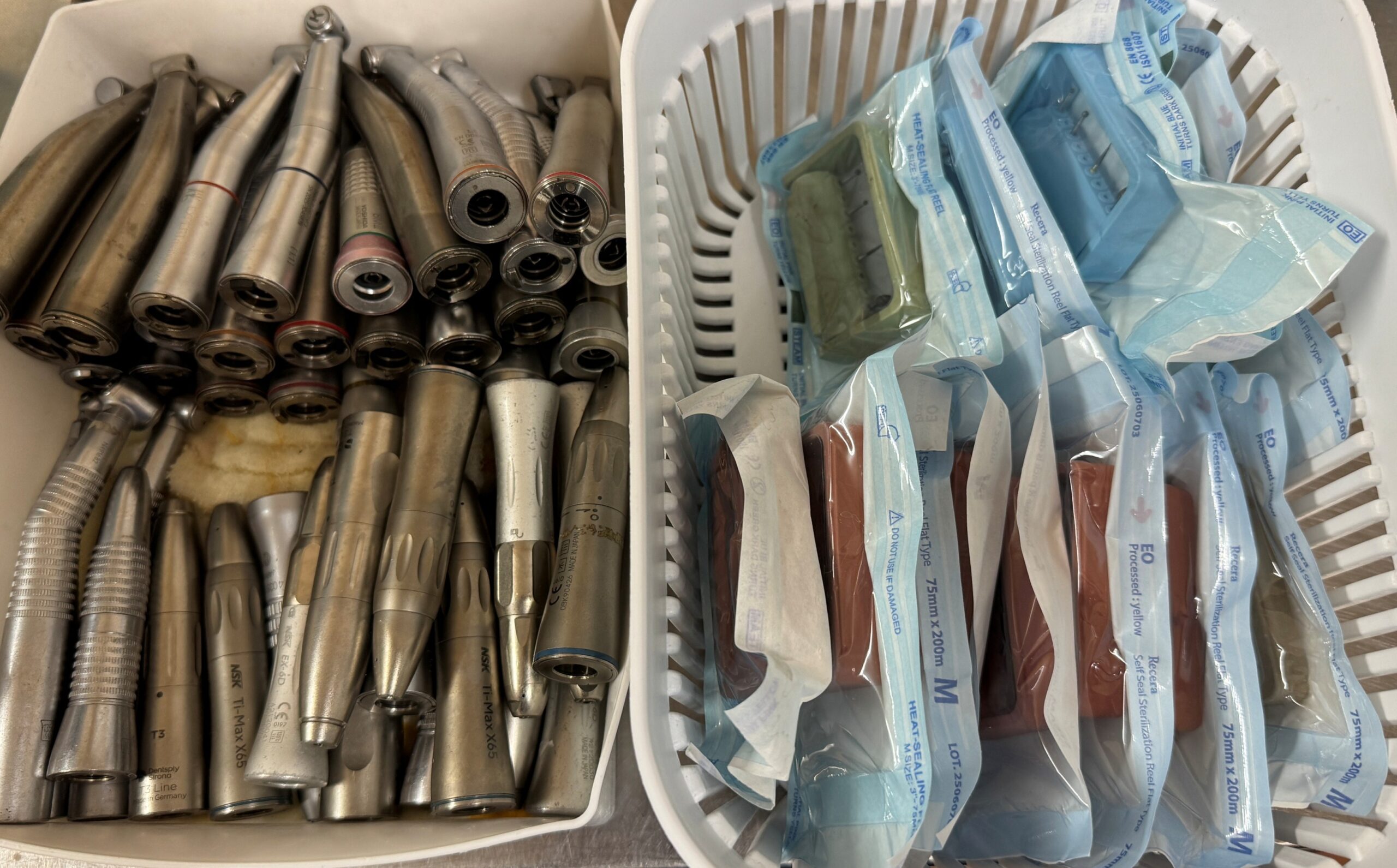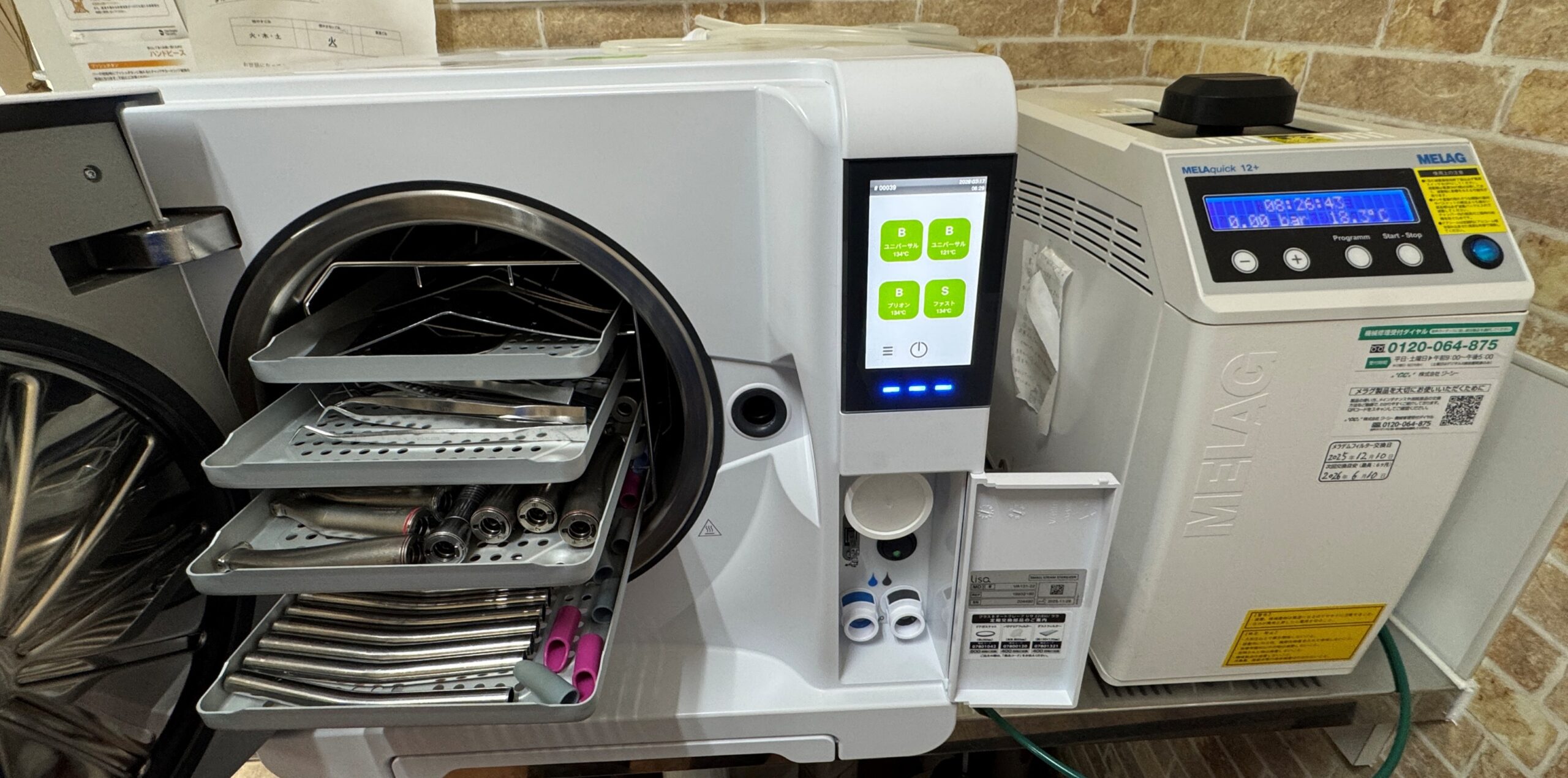 治療器具の徹底的、洗浄、滅菌を行っております、高圧蒸気滅菌により、治療器具を滅菌処理、治療器具はパッキングしておりますので、滅菌状態を保って保管しております。